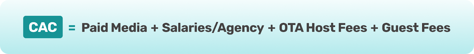 Ultimately, CAC is just a way to measure what it really costs you to bring in each new guest. Take all your sales and marketing expenses (ads, software, agency fees, *and* platform commissions) and divide by the number of first-time guests you gained.
